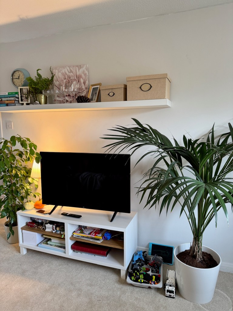 shelves, TVs, mirrors and curtains